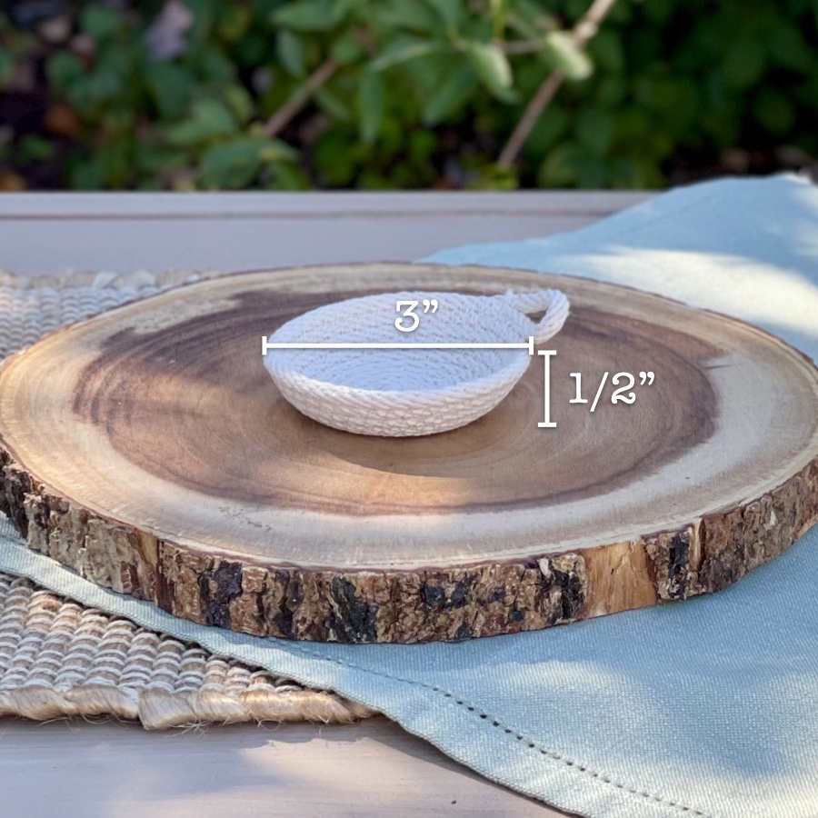 The Trinket Coiled Rope Bowl from our fall collection is handmade from 100% cotton rope, sourced in the USA, and the highest quality Egyptian cotton thread. Measuring approximately 2 inches in diameter at the base, 3 inches in diameter at the rim, and standing 1/2 inch tall, this cute, miniature bowl is the perfect catch-all for your small items.